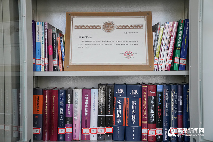 ▲辛永寧辦公室的書柜里滿是醫(yī)學(xué)書籍。