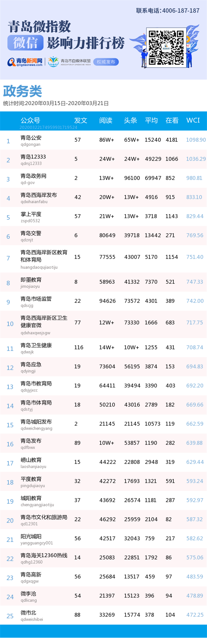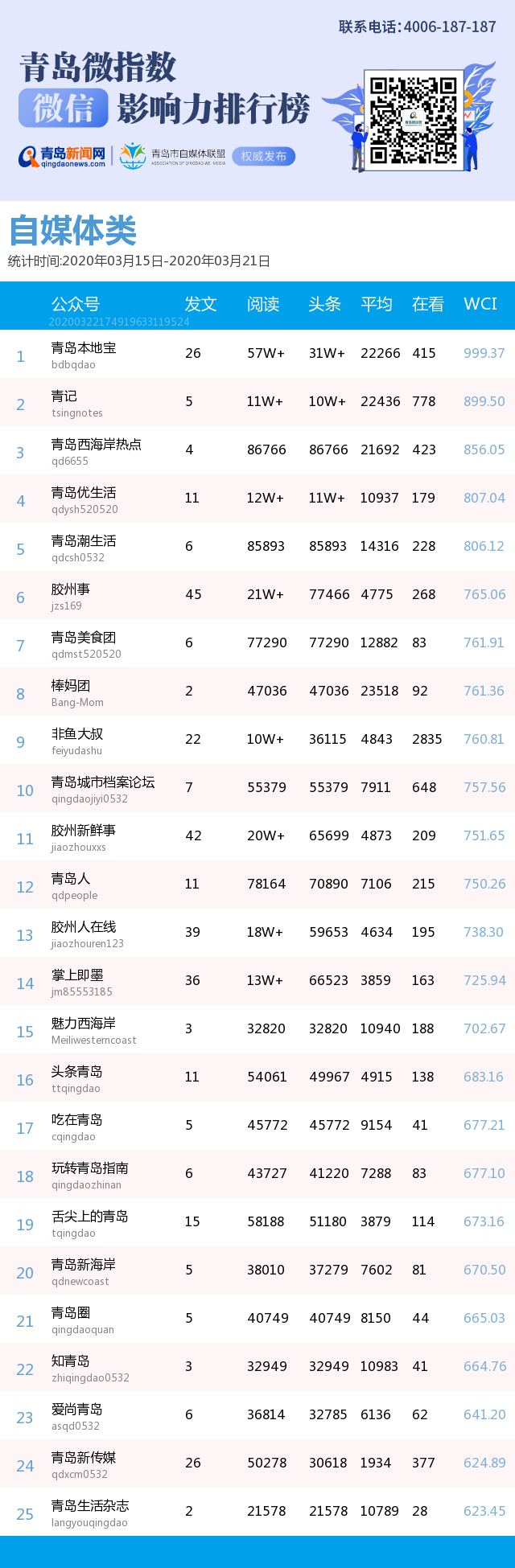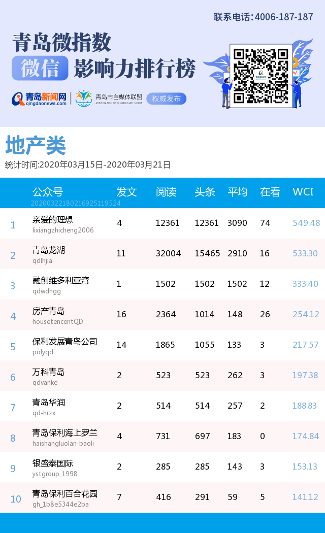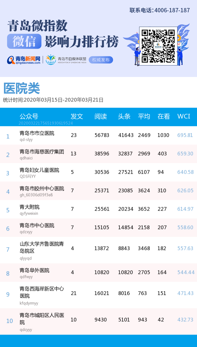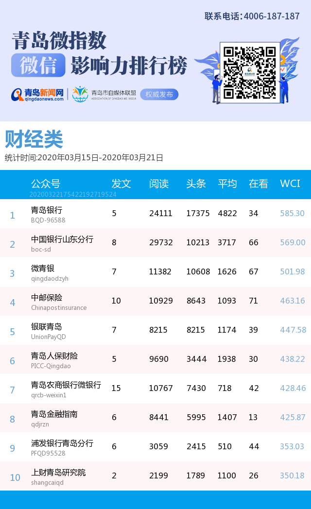 青島新聞網(wǎng)3月23日訊(記者 邢書玲)由青島新聞網(wǎng)打造的“青島微指數(shù)微信影響力排行榜”今日發(fā)布一周(2020年3月15日-2020年3月21日)榜單。