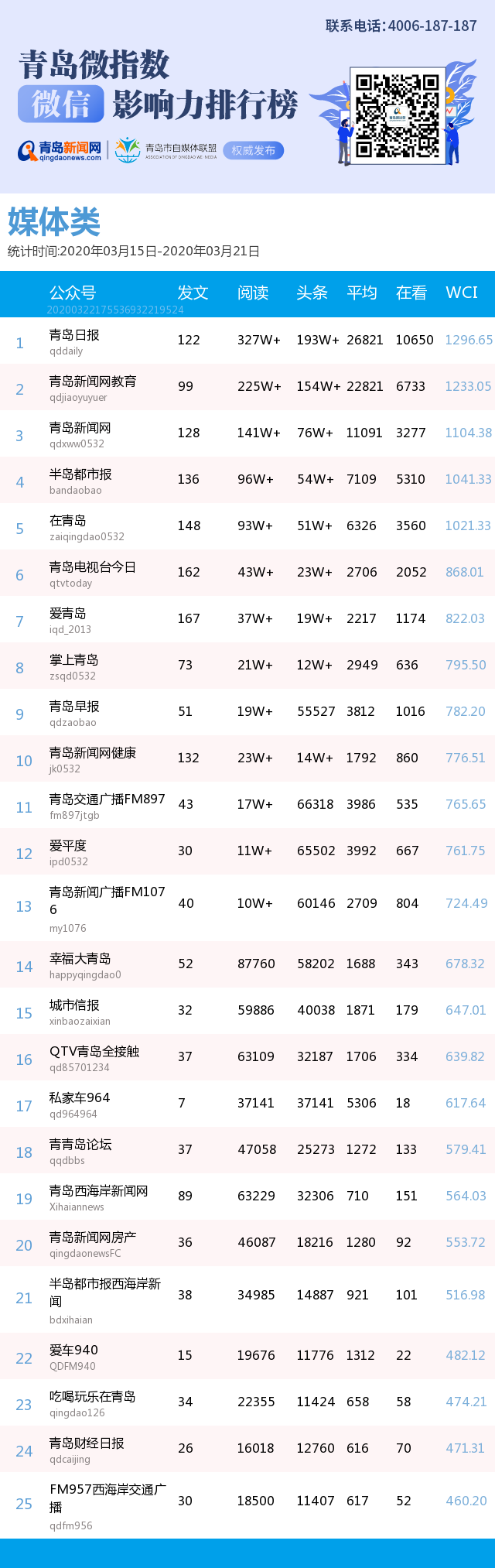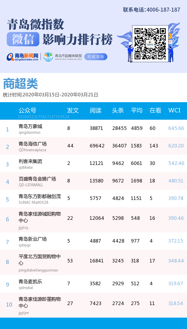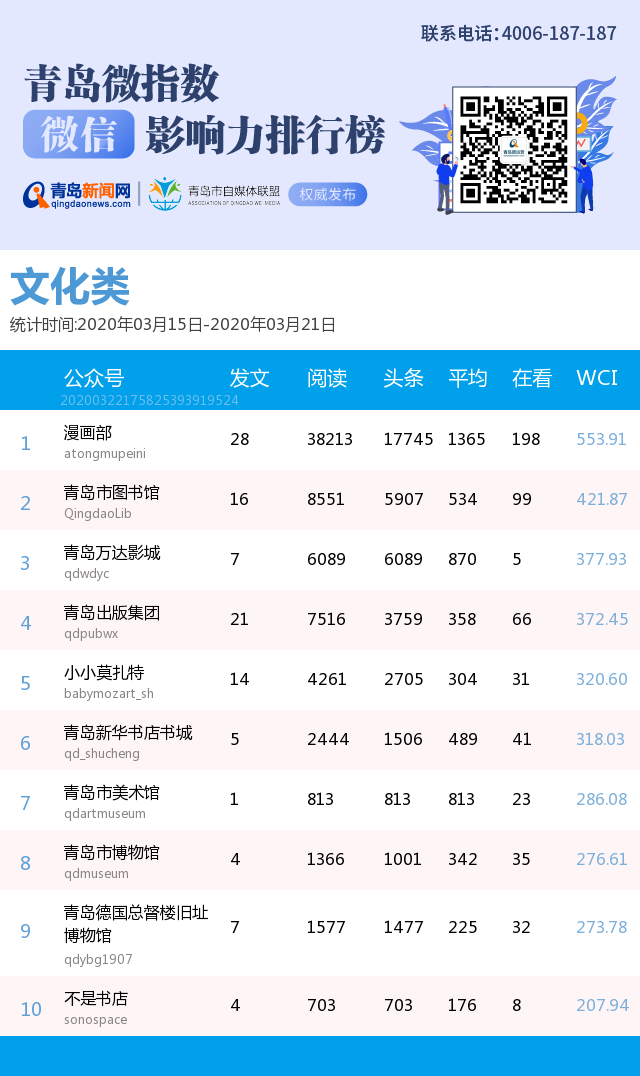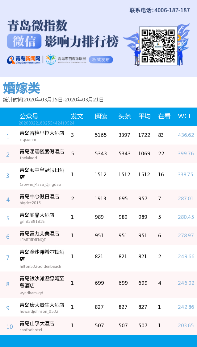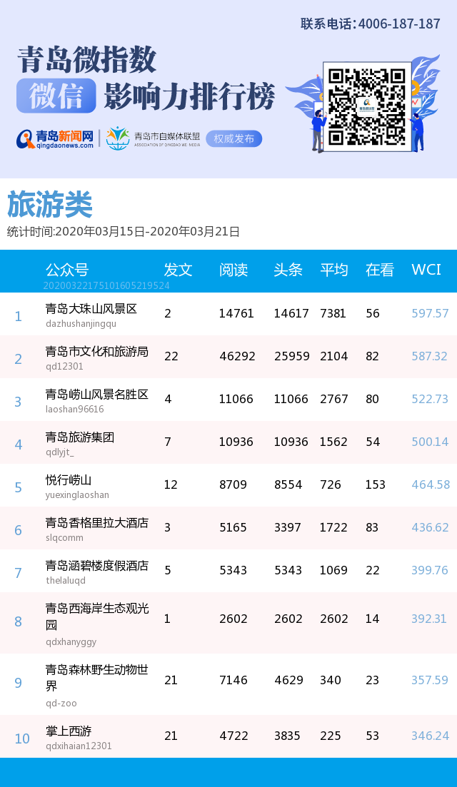 3、本次榜單收錄了青島14個(gè)行業(yè)微信公眾號(hào),如您的賬號(hào)暫未收錄,可聯(lián)系4006-187-187。