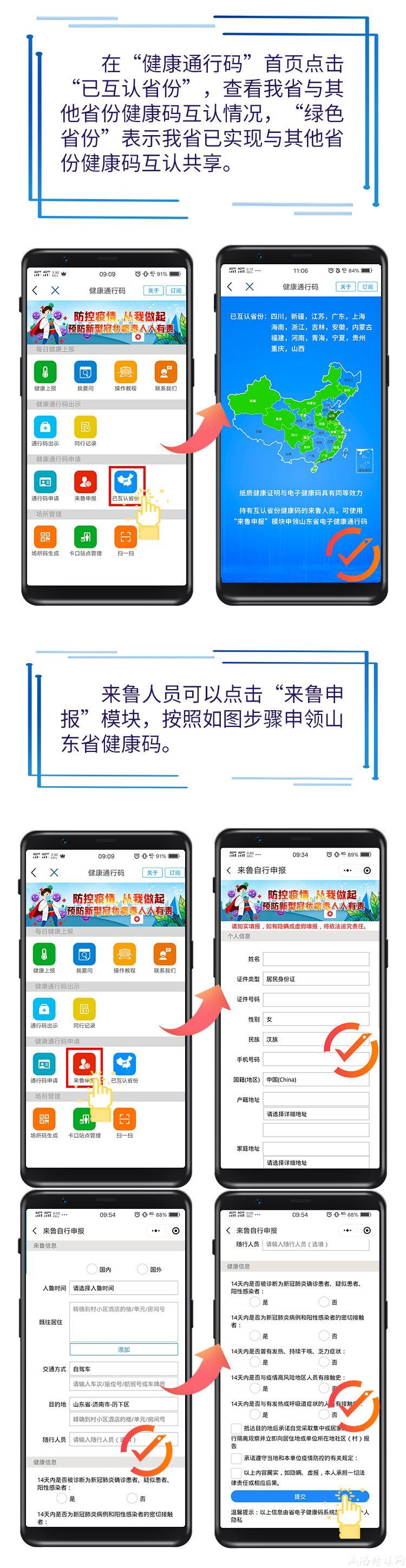 可通過“已互認(rèn)省份”查看山東省與其他省份健康碼互認(rèn)情況。截至目前,已有廣東、上海、浙江等17省市與山東簽訂互認(rèn)協(xié)議。從這些省份來魯(返魯)的人員,到達(dá)山東省后憑省外綠碼一律放行,不需隔離。為了更加便于省內(nèi)通行,建議來魯人員下載“愛山東”使用“來魯申報(bào)”模塊,申領(lǐng)“健康通行碼”。如下圖: