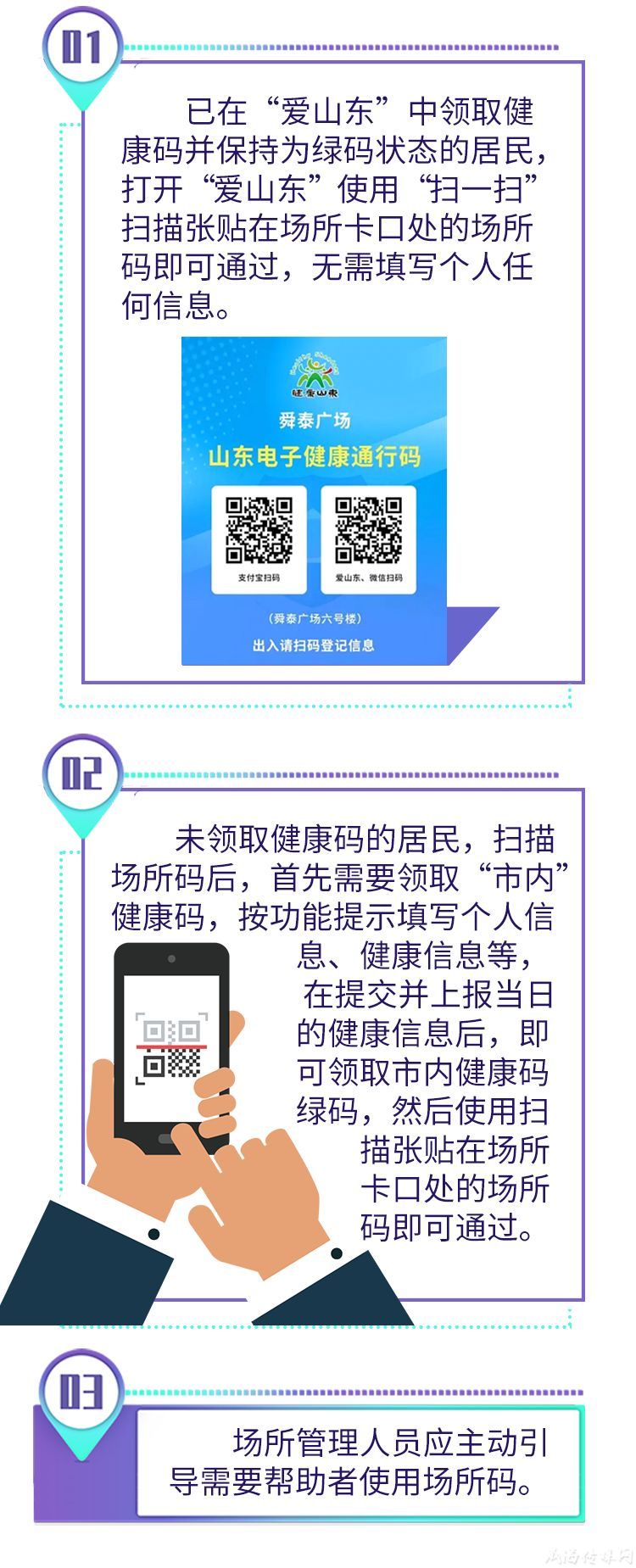 疫情期間,所有已在“愛山東”申領(lǐng)“健康通行碼”并保持為綠碼狀態(tài)的出行人,到全省的餐飲、購物、酒店、醫(yī)療、教學(xué)、文化旅游、生產(chǎn)加工、交通工具、交通樞紐、政務(wù)服務(wù)大廳、辦公樓和社區(qū)等重點(diǎn)場所時(shí),只需打開“愛山東”APP,使用“掃一掃”功能,掃描對應(yīng)場所碼即可通行,無需填寫個(gè)人任何信息。如下圖: