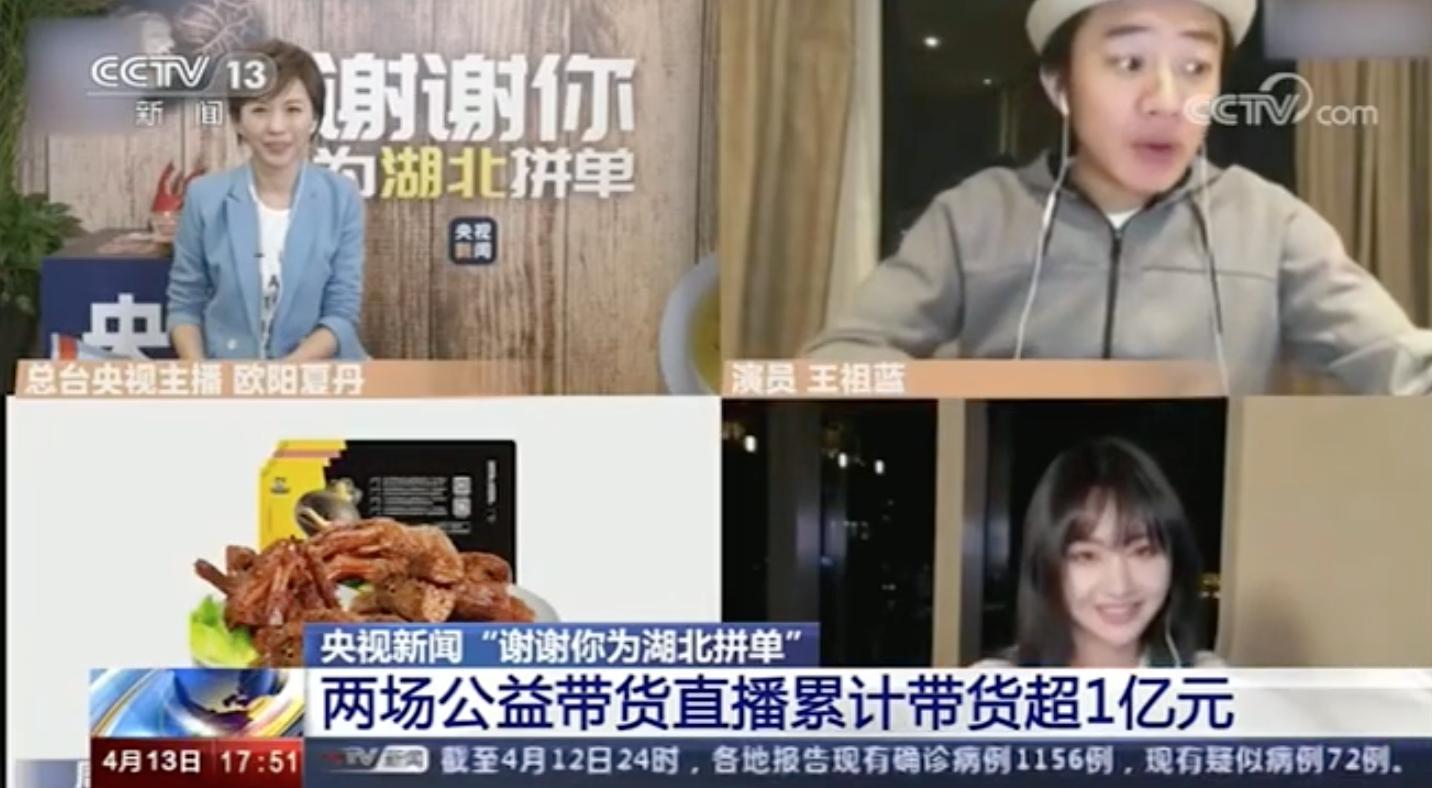 “謝謝你,為湖北拼單!”在攜手老鐵用戶為湖北拼單6100萬之后,“祖藍夏丹”主持的快手專場直播帶貨助力湖北活動登陸4月13日的新聞聯(lián)播,以及當(dāng)天下午的新聞頻道“新聞直播間”欄目。