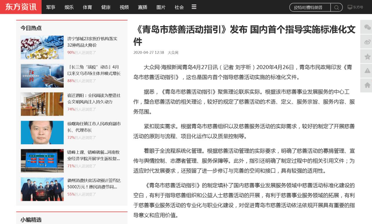 東方財富網(wǎng):青島發(fā)布國內(nèi)首個指導(dǎo)慈善活動實施標(biāo)準(zhǔn)化文件