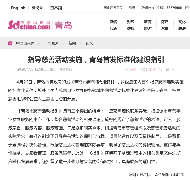 中國山東網(wǎng):指導(dǎo)慈善活動實施,青島首發(fā)標(biāo)準(zhǔn)化建設(shè)指引