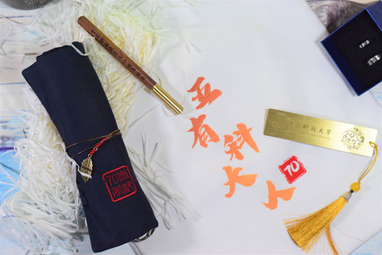 本次捐贈的作品包括擺件、筆袋、鋼筆、衣物、茶具、水杯、購物袋、手機殼、書簽等,構成元素有學校景觀、校訓、70周年校慶標識、“五有”理念等,具備一定實用和收藏價值。全部作品均由韓宇設計。