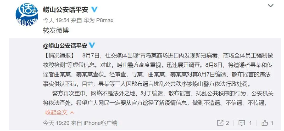 網(wǎng)傳“青島某商場進(jìn)口肉發(fā)現(xiàn)新冠病毒,商場全體員工強(qiáng)制做核酸檢測”?假的!剛剛,青島市公安局嶗山分局官方微博@嶗山公安話平安回應(yīng)了!