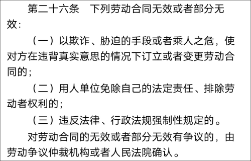 《中華人民共和國(guó)勞動(dòng)合同法》第二十六條規(guī)定,下列勞動(dòng)合同無(wú)效或者部分無(wú)效: