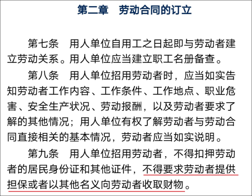 《中華人民共和國(guó)勞動(dòng)合同法》第九條規(guī)定,用人單位招用勞動(dòng)者,不得扣押勞動(dòng)者的居民身份證和其他證件,不得要求勞動(dòng)者提供擔(dān)?;蛘咭云渌x向勞動(dòng)者收取財(cái)物。