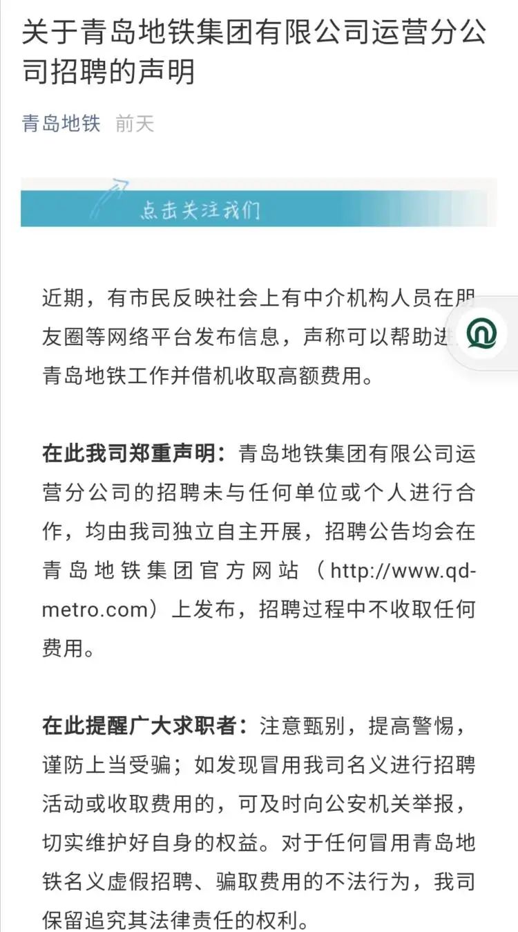 日前,青島地鐵集團(tuán)通過官方微信發(fā)布鄭重聲明:青島地鐵集團(tuán)有限公司運(yùn)營分公司的招聘未與任何單位或個(gè)人進(jìn)行合作,均由我司獨(dú)立自主開展,招聘公告均會在青島地鐵集團(tuán)官方網(wǎng)站()上發(fā)布,招聘過程中不收取任何費(fèi)用。