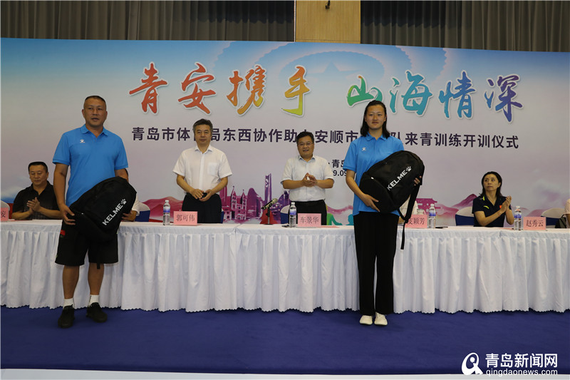 青島新聞網(wǎng)9月10日訊 (記者 劉文超)9月9日上午,“青安攜手 山海情深”青島市體育局東西協(xié)作助力安順市運(yùn)動(dòng)隊(duì)來(lái)青訓(xùn)練開(kāi)訓(xùn)儀式在青島市體育運(yùn)動(dòng)學(xué)校舉行。開(kāi)訓(xùn)儀式上,青島市體育局黨組書(shū)記、局長(zhǎng),市體育總會(huì)主席車景華,青島市扶貧協(xié)作辦一級(jí)調(diào)研員郭可偉向安順市體育局教練員、運(yùn)動(dòng)員代表贈(zèng)送訓(xùn)練裝備,拉開(kāi)了安順市運(yùn)動(dòng)隊(duì)本次來(lái)青訓(xùn)練的序幕。