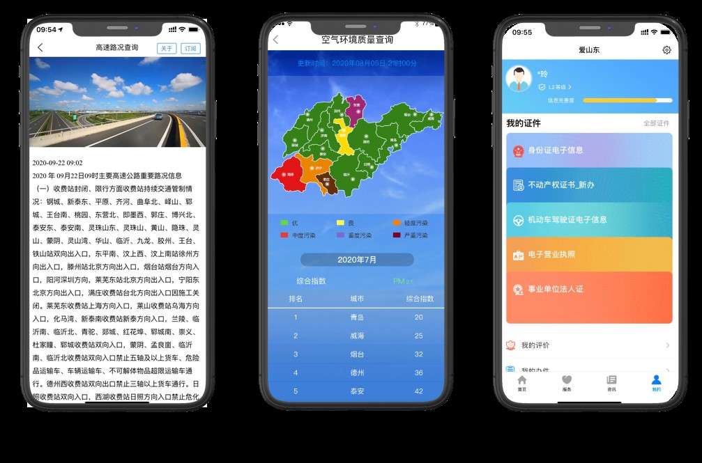 此外,在山東打開“愛山東”APP,還能查詢高速路況、環(huán)境氣象、駕駛員記分等出行服務。同時,將電子身份證、駕駛證、行駛證等常用電子證照提前領取放入“卡包”中,出行在外,證件遺失忘帶也能輕松應對,真正實現(xiàn)“一部手機走齊魯”。