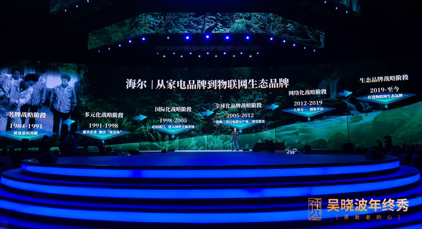 現(xiàn)場,吳曉波分享了他認(rèn)為的, 2021年可能發(fā)生的八大現(xiàn)象和趨勢。其中,在第三個(gè)預(yù)測——“生態(tài)賦能范式既成”中,他以海爾為案例,講述了海爾創(chuàng)業(yè) 36年來的不斷革新和生態(tài)品牌的持續(xù)探索。吳曉波說,自我革命的大型公司,正在貢獻(xiàn)數(shù)字化轉(zhuǎn)型的中國范式。