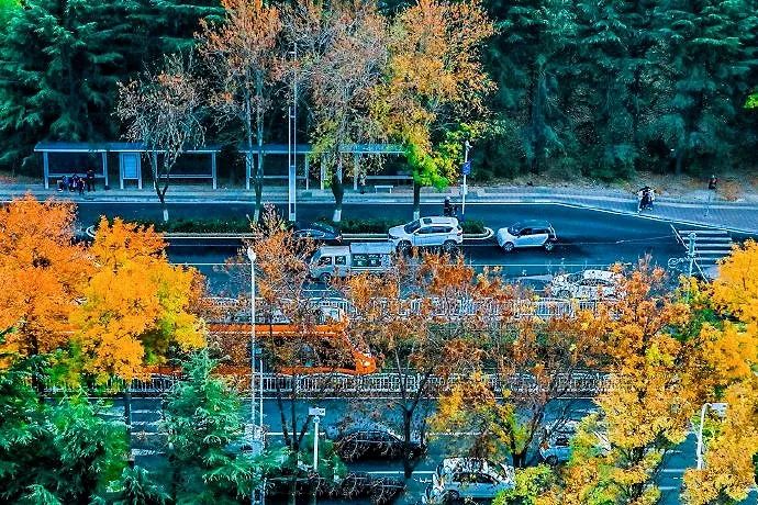 當(dāng)秋天來(lái)臨,天高氣爽,秋意盎然,城陽(yáng)區(qū)有軌電車線行車道兩側(cè)的樹木浸染了秋意。