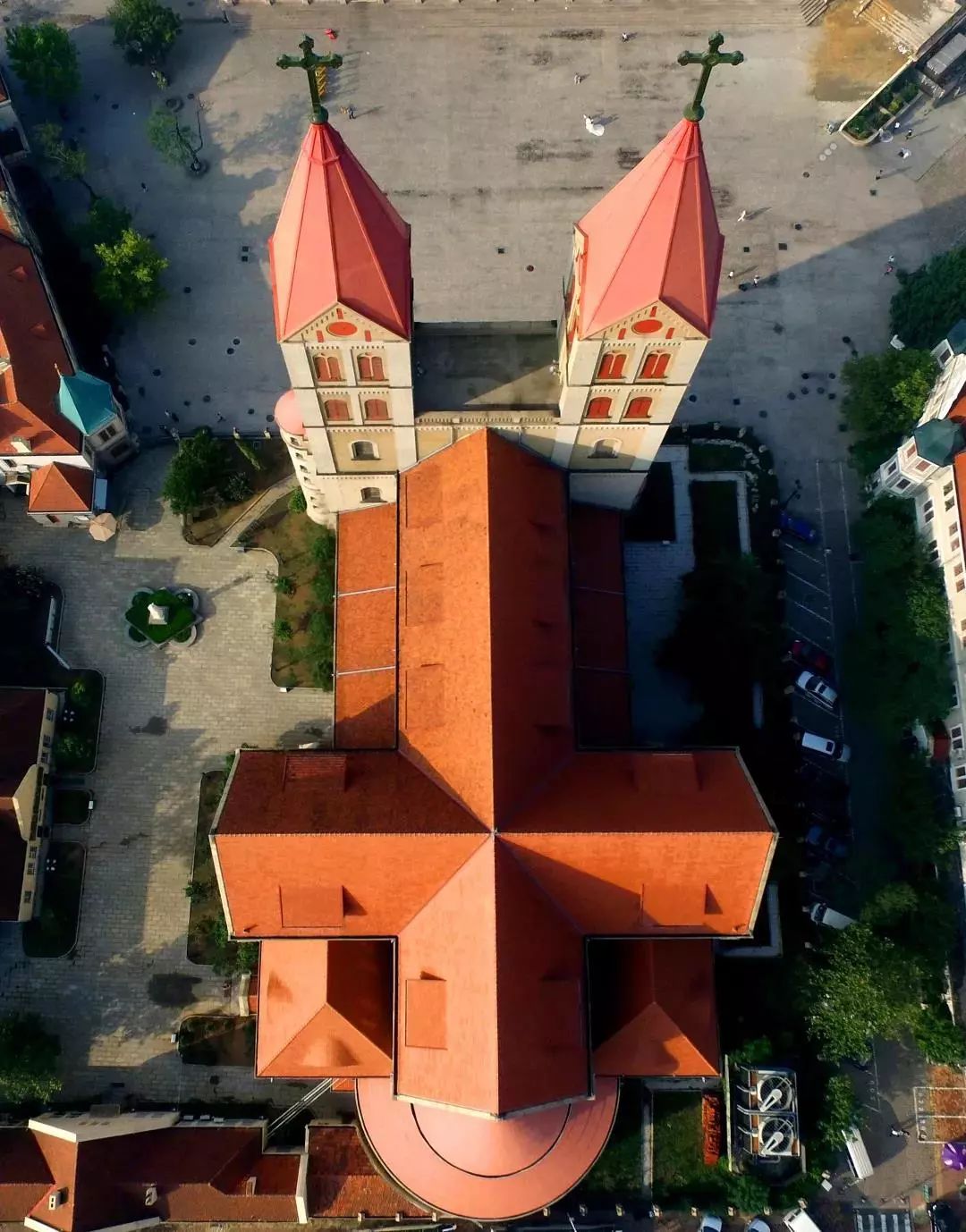 從空中俯視,屋頂覆蓋舌頭紅瓦,整個教堂形成一個巨大的十字,氣勢龐大,古樸典雅。