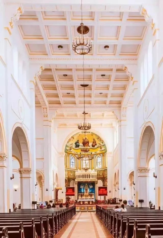 七只銅制大吊燈懸于頂棚,后方設(shè)有祭臺,配之穹頂?shù)氖ハ癖诋?有圣經(jīng)故事的六幅掛像及兩幅壁畫,莊嚴肅穆。