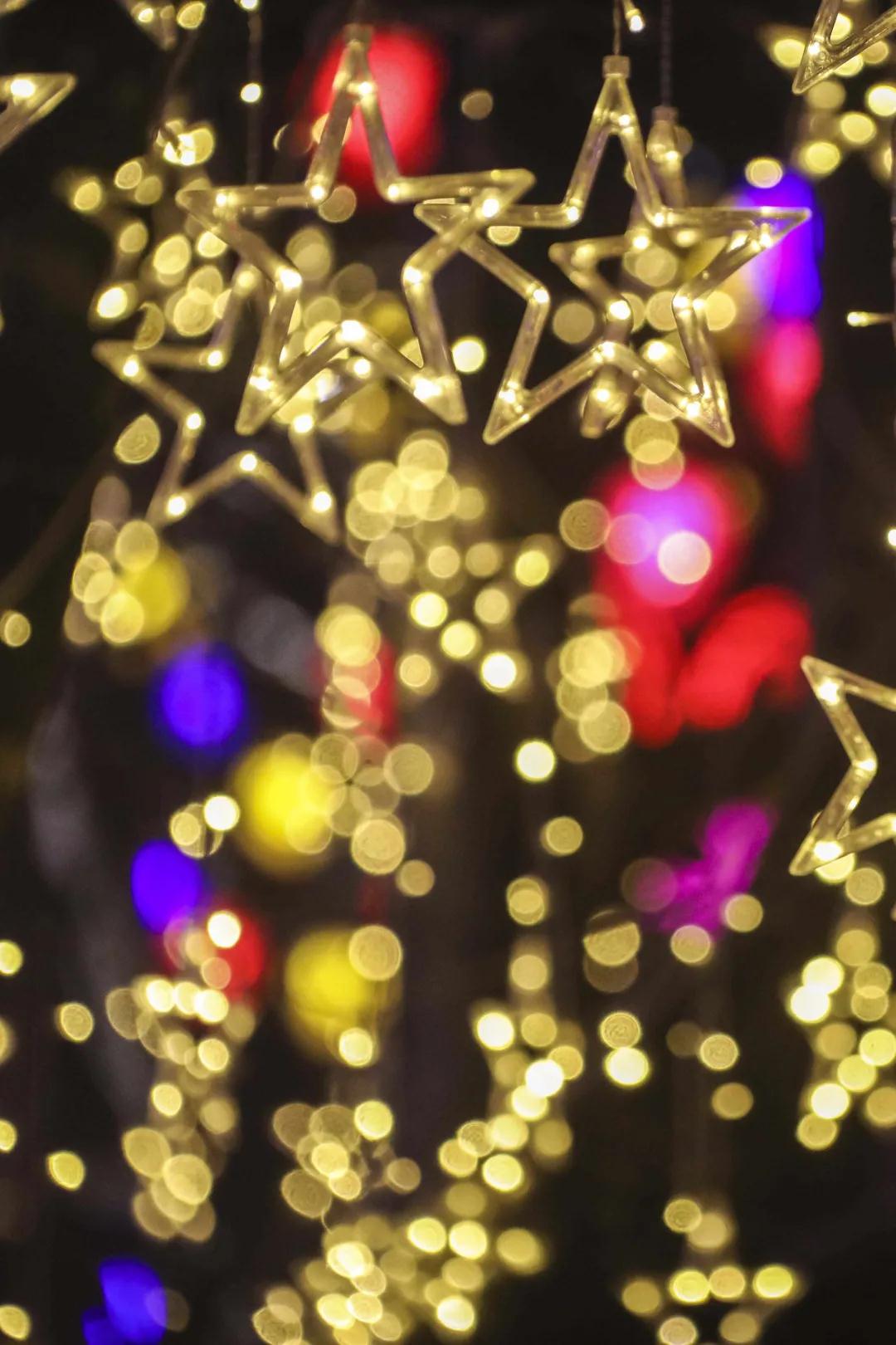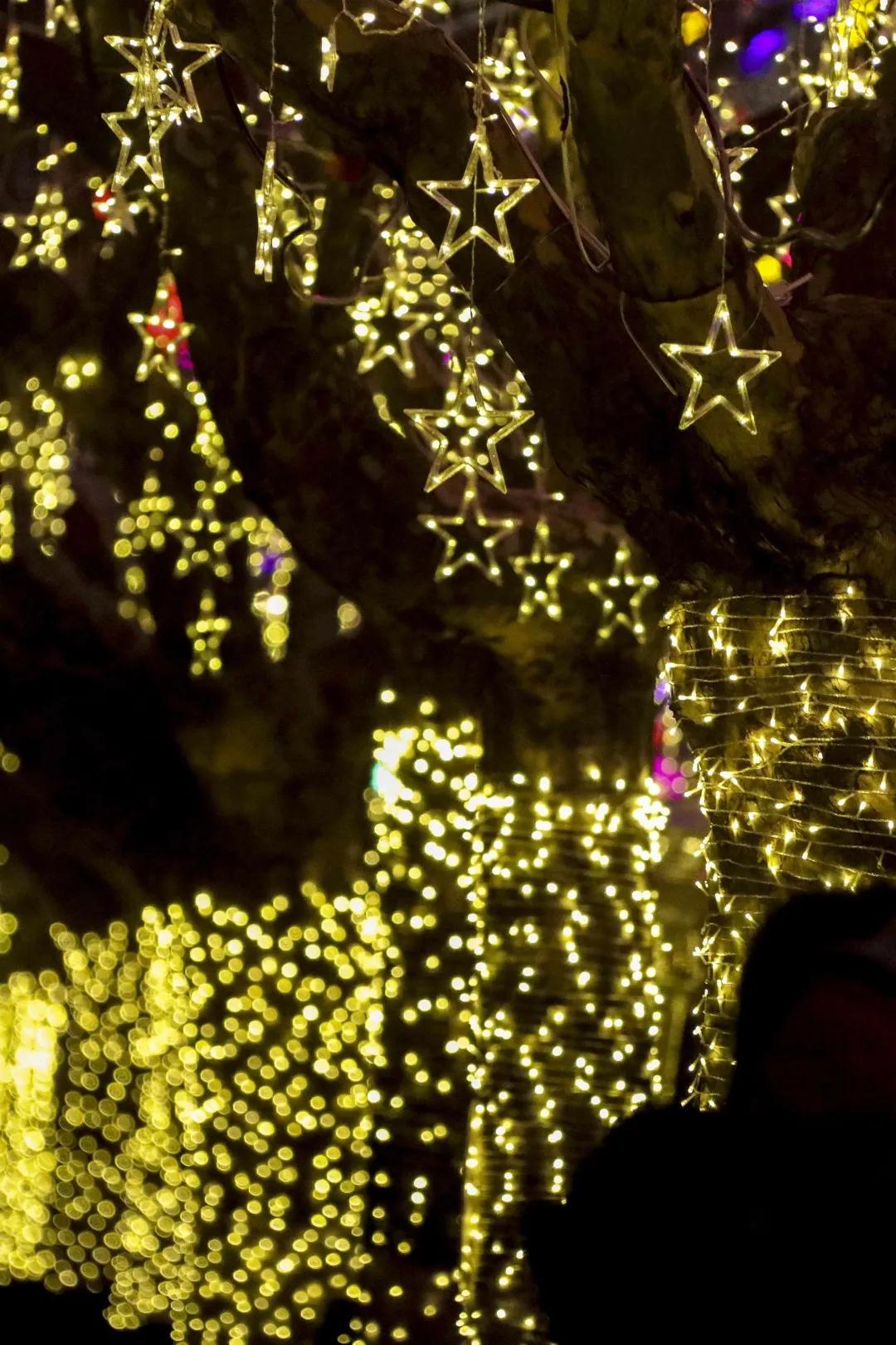 這場“光影秀”可遠(yuǎn)觀,也可近賞。遠(yuǎn)看是一片“星?!保呓屑?xì)看掛在樹上的小燈形狀各異,有閃爍的“星星”,有生動的“蝴蝶”,這條路走起來都有趣了許多。