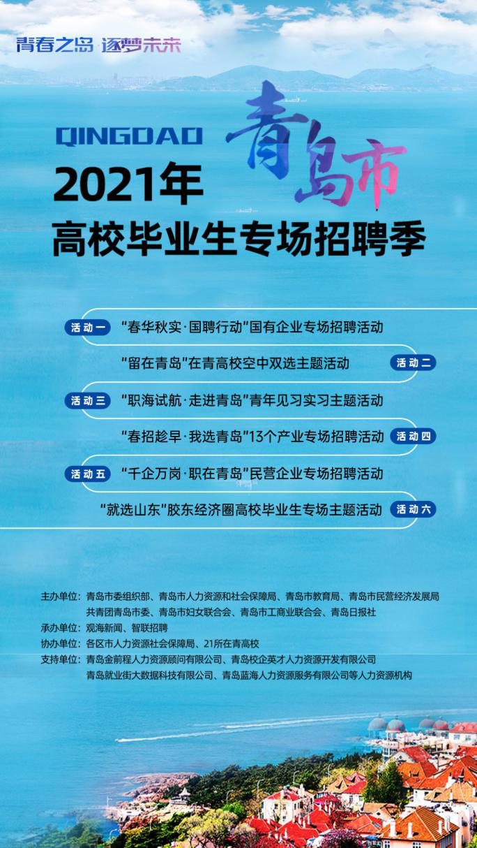 青島新聞網(wǎng)2月24日訊 2021年2月23日,“青春之島·逐夢未來”2021年青島市高校畢業(yè)生專場招聘季活動在全球253.5萬人共同在線見證下,正式啟動。接下來的98天,招聘季將根據(jù)海內(nèi)外高校畢業(yè)生、在校生的不同求職特點,通過線上線下招聘、實習見習對接、企業(yè)走訪觀摩、政策宣講解讀、職業(yè)規(guī)劃指導等形式、陸續(xù)開展“春華秋實·國聘行動”國有企業(yè)專場招聘活動、“留在青島”在青高??罩须p選活動、“職海試航·走進青島”青年見習實習活動、“春招趁早·我選青島”13個產(chǎn)業(yè)專場招聘活動、“千企萬崗·職在青島”民營企業(yè)專場招聘活動、“就選山東”膠東經(jīng)濟圈高校畢業(yè)生招聘六大主題活動。