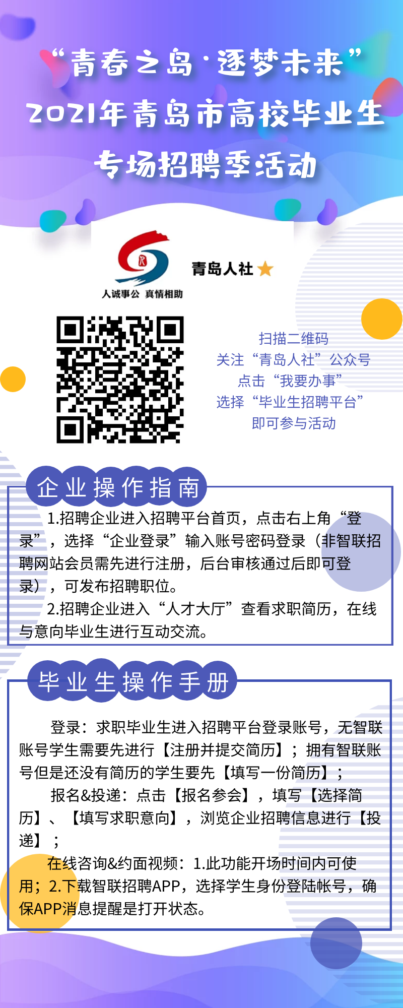 有意向參加招聘活動的用人單位和高校畢業(yè)生可掃描下方二維碼關注“青島人社”微信公眾號,進入青島市高校畢業(yè)生網(wǎng)絡招聘平臺參加招聘會。