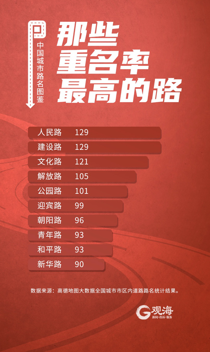 報告顯示,全國城市內(nèi)道路中重名率最高的是人民路和建設(shè)路,均有129座城市采用。文化路,解放路,公園路,迎賓路,朝陽路,青年路,和平路和新華路分列三到十位。