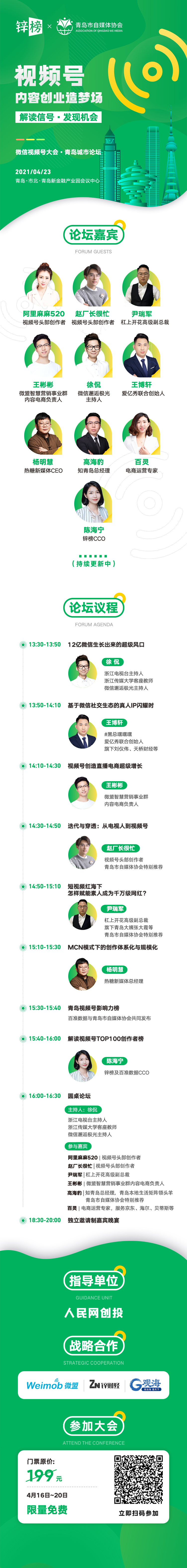 論壇圍繞《視頻號(hào)——內(nèi)容創(chuàng)業(yè)新機(jī)遇,品牌應(yīng)用新場(chǎng)所》主題,將通過(guò)主講和圓桌分享對(duì)微信視頻號(hào)形成的全新微信超級(jí)生態(tài)、個(gè)體通過(guò)短視頻增長(zhǎng)風(fēng)口獲得內(nèi)容創(chuàng)業(yè)新成就以及品牌通過(guò)微信超級(jí)生態(tài)全新場(chǎng)景實(shí)踐數(shù)字營(yíng)銷增長(zhǎng)新戰(zhàn)略進(jìn)行討論。視頻號(hào)頭部創(chuàng)作者“阿里麻麻520”、“趙廠長(zhǎng)很忙”、鋅榜CCO陳海寧以及尹瑞軍、王彬彬、徐侃、王博軒、楊明慧、高海豹、百靈作為被邀嘉賓屆時(shí)將參與論壇。