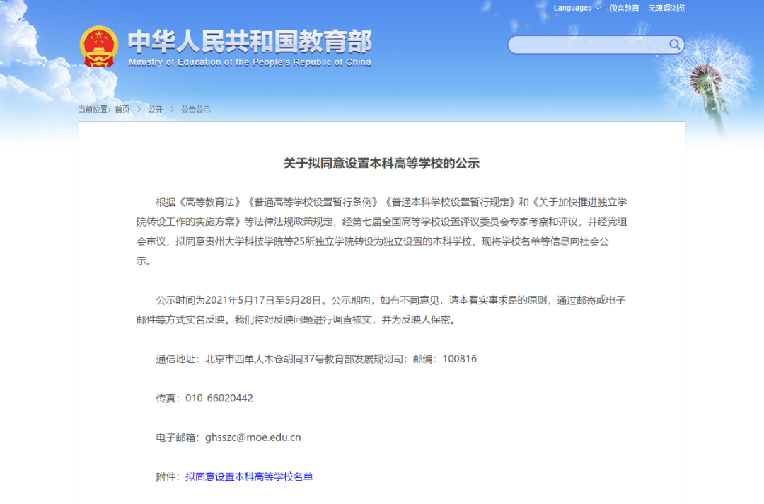 根據(jù)《高等教育法》《普通高等學(xué)校設(shè)置暫行條例》《普通本科學(xué)校設(shè)置暫行規(guī)定》和《關(guān)于加快推進(jìn)獨(dú)立學(xué)院轉(zhuǎn)設(shè)工作的實(shí)施方案》等法律法規(guī)政策規(guī)定,經(jīng)第七屆全國(guó)高等學(xué)校設(shè)置評(píng)議委員會(huì)專家考察和評(píng)議,并經(jīng)黨組會(huì)審議,擬同意貴州大學(xué)科技學(xué)院等25所獨(dú)立學(xué)院轉(zhuǎn)設(shè)為獨(dú)立設(shè)置的本科學(xué)校,現(xiàn)將學(xué)校名單等信息向社會(huì)公示。
