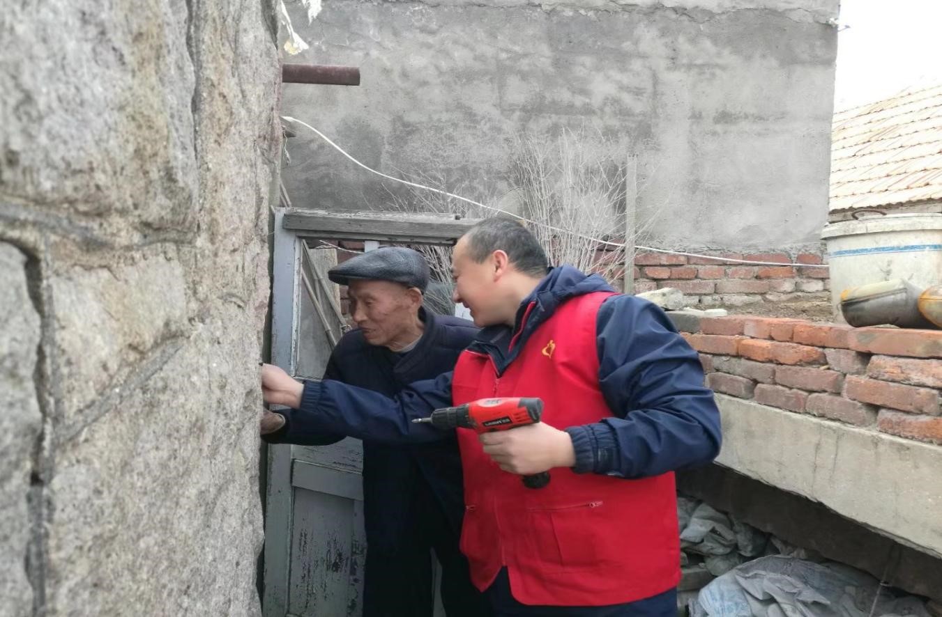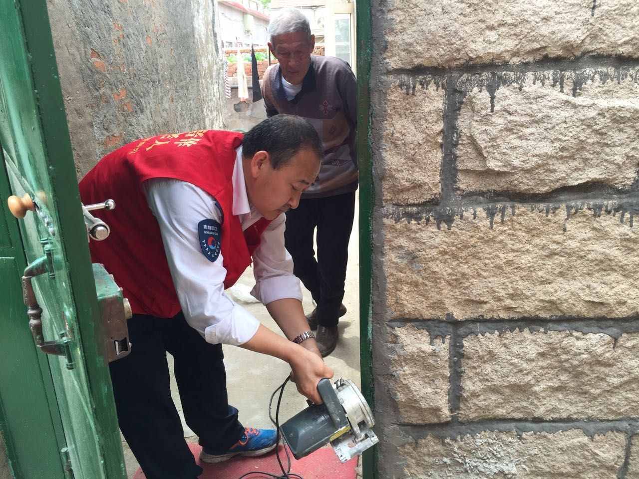 在以后的陪伴中,我就開始細心的觀察,有時候與老人的交談中也暗中打探老人有沒有需要的東西,了解情況后我們都會積極努力地去幫老人解決困難。夏天,我們?yōu)槔先嗽鹤永锎钇鹫陉柵?,冬天,為老人院子里的水管加上保溫棉。每一件事情都是細心觀察,用心去做!我們結(jié)對的空巢老人中有位叫曲方平的大爺,性格開朗,非常健談,但是有一件事情困擾著大爺十幾年,曲大爺年屆9旬,聽力不好,曲大爺家有一個院子,老人獨居屋內(nèi),院子的鐵門從里面鎖上,有人來敲門,老人聽不見,外面的人就非常著急,所以曲大爺就問我們志愿者有沒有什么好辦法幫他解決這個難題。我得知大爺?shù)倪@個心愿后,立即開動腦筋想辦法,經(jīng)過好幾天的苦思冥想,終于確定下了解決方案,我買來插銷,帶上工具,為曲大爺家的鐵門安上了合適的插銷,使鐵門里外都能打開,門打開了,也打開了曲大爺十幾年的心結(jié)。大爺試過以后感覺既美觀又實用,逢人就夸志愿者真有本事,沒有解決不了的事!