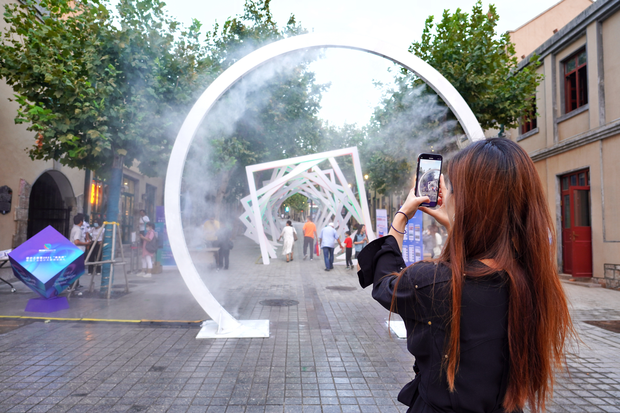 活動現(xiàn)場還設(shè)有光影隧道、中秋水霧門、互動感應(yīng)雙翼、月光秋千等體驗項目,市民可以參與沉浸式體驗互動。這些互動體驗裝置分散在廣興里的各處,不同的造型寓含不同的意義,水霧朦朧中仿佛身臨夢幻之境,光影變幻中又仿佛置身科幻大片,吸引了眾多參觀者紛紛打卡拍照,為老城的夜晚增添了生動意趣,為市民、游客進(jìn)行了一次沉浸式的“工業(yè)設(shè)計”科普,讓更多人對“工匠之城”產(chǎn)生情感共鳴,“市長杯”這一IP的傳播力進(jìn)一步提升。“游園會”延續(xù)至21日,這期間,歡迎廣大市民前往青島工業(yè)設(shè)計創(chuàng)新中心中庭廣場(市北區(qū)海泊路63號廣興里)參觀。
