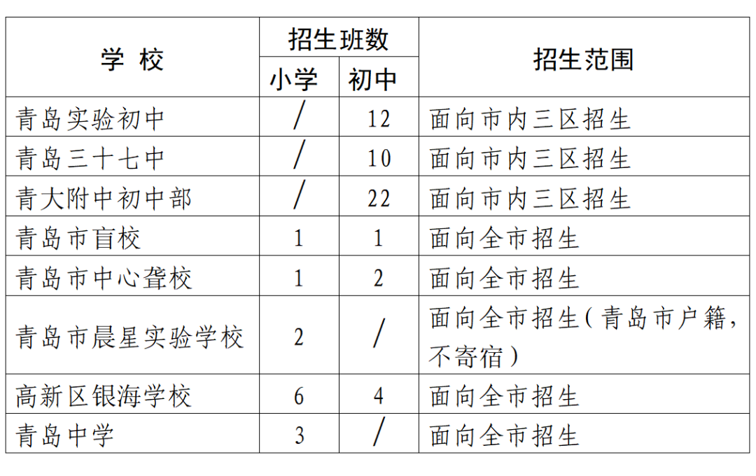 第二階段:所有民辦初中學(xué)校與區(qū)市所屬公辦初中學(xué)校同步招生。青大附中初中部招生由市教育局負(fù)責(zé)組織。其他初中學(xué)校由區(qū)市教育行政部門負(fù)責(zé)組織。青島三十九中初中部納入市南區(qū)招生范圍,招生方式與市南區(qū)中片公辦初中學(xué)校相同。