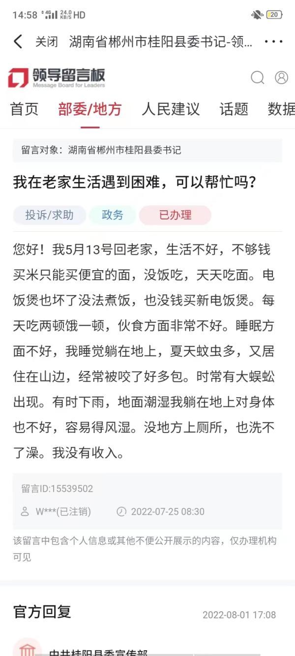 今年7月25日,陳橙在某平臺(tái)網(wǎng)站的領(lǐng)導(dǎo)留言板寫下:“我5月13日回老家,生活不好,沒(méi)飯吃,天天吃面……我睡覺(jué)躺在地上,沒(méi)地方上廁所,我沒(méi)有收入……”他標(biāo)注留言對(duì)象是湖南省郴州市桂陽(yáng)縣委書(shū)記。