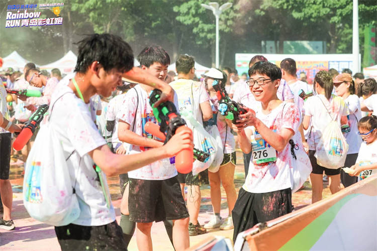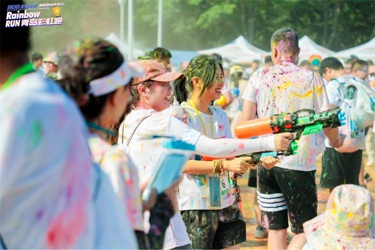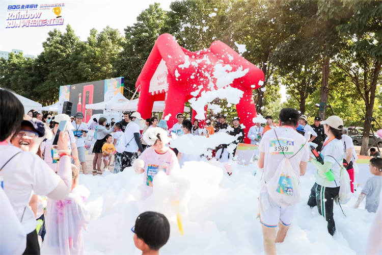 伴隨著動(dòng)感的音樂,水槍大戰(zhàn)+電音派對(duì)同時(shí)開啟,DJ與舞者帶領(lǐng)全場(chǎng)一起嗨翻這一刻,大家把彩色玉米粉同時(shí)拋向空中,彩色的粉末隨風(fēng)飛舞,吶喊與歡呼交織,色彩與青春碰撞,匯聚成一道道絢爛無比的彩虹人潮。參賽者還不忘拿起水槍互相噴射,有人更是被眾多人“圍攻”,頭發(fā)上、臉上都是不同的顏色,每個(gè)臉龐都像調(diào)色盤一樣繽紛生動(dòng)。更有巨型“泡泡槍”將超多白色泡沫噴向空中,瞬間把狂歡氣氛推向高潮。大人與小孩都在潔白細(xì)膩的泡沫里穿梭翻滾,歡樂的笑臉與笑聲連成片,千余人一起洗泡泡浴,這樣的體驗(yàn)可是非常難得的,相信這快樂又神奇的時(shí)刻將深深印在每個(gè)人的腦海里。