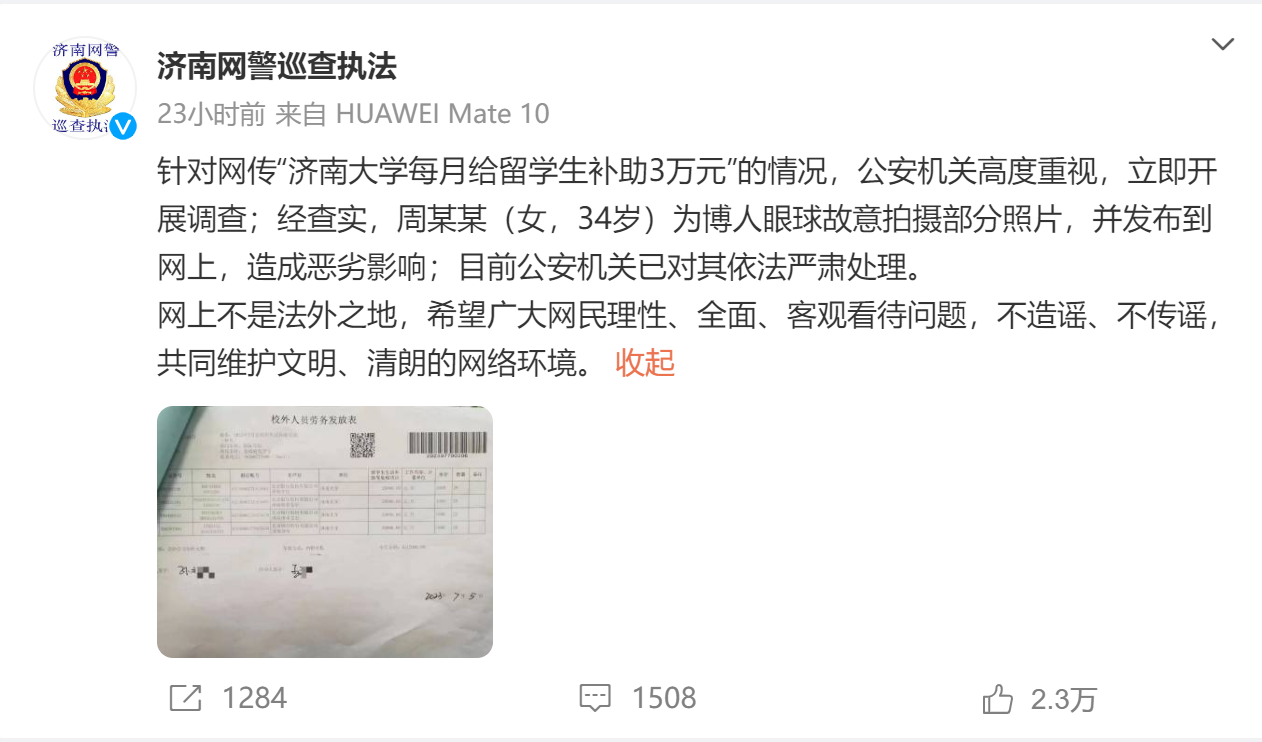 據@濟南網警巡查執(zhí)法:針對網傳“濟南大學每月給留學生補助3萬元”的情況,公安機關高度重視,立即開展調查;經查實,周某某(女,34歲)為博人眼球故意拍攝部分照片,并發(fā)布到網上,造成惡劣影響;目前公安機關已對其依法嚴肅處理。