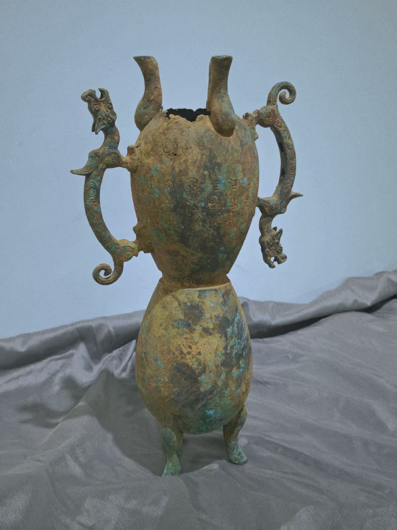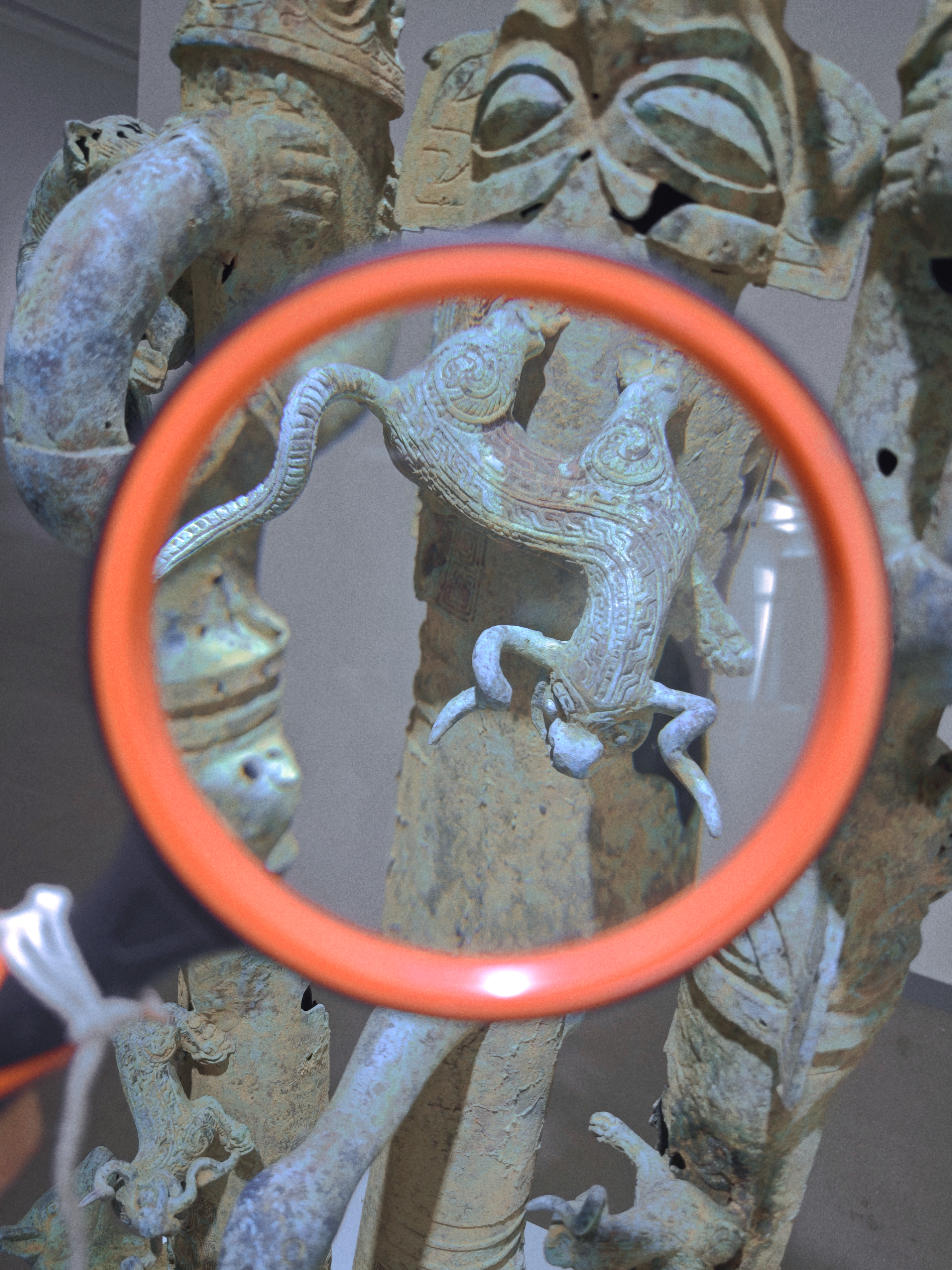 依托千年青銅工藝之鄉(xiāng)的頂尖技術(shù),呈現(xiàn)令人驚嘆的“出土文物”質(zhì)感,一件器物里可能藏著:商周到秦漢時(shí)期的食器、禮器、樂器或武器;三星堆的青銅神樹;秦漢的箭簇;夾帶著現(xiàn)代文明的新物舊作;觀展現(xiàn)場(chǎng)配備放大鏡。