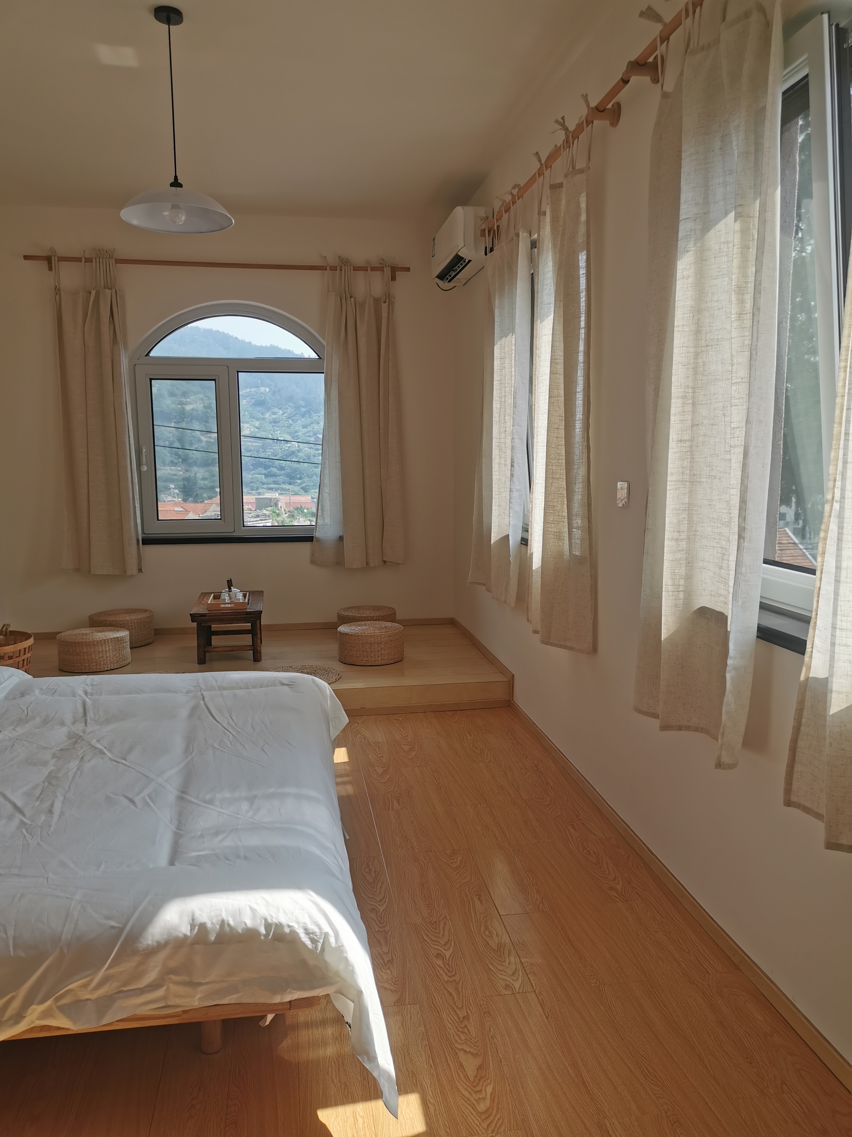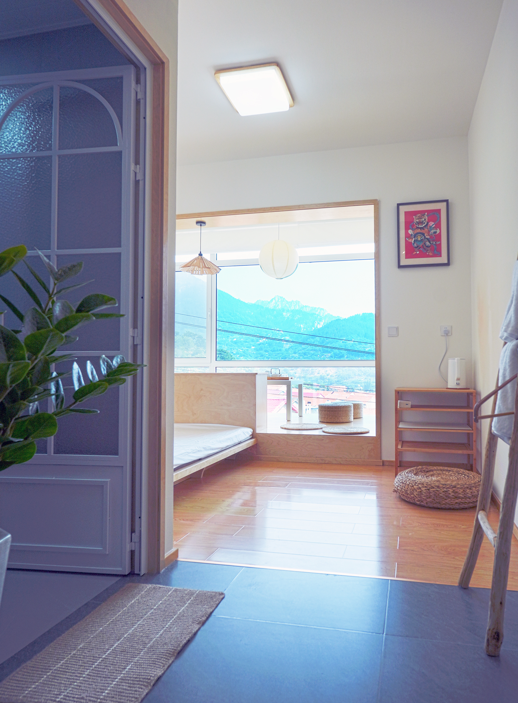 民宿是三層獨棟別墅,一共有5個房間,每個房間的名字都超有巧思,是以南九水的村子來命名的,超有儀式感!一樓:西九水、東九水;二樓:柳樹臺、寨上、大石村,配有全景落地窗,躺在床上就能將山景盡收眼底。