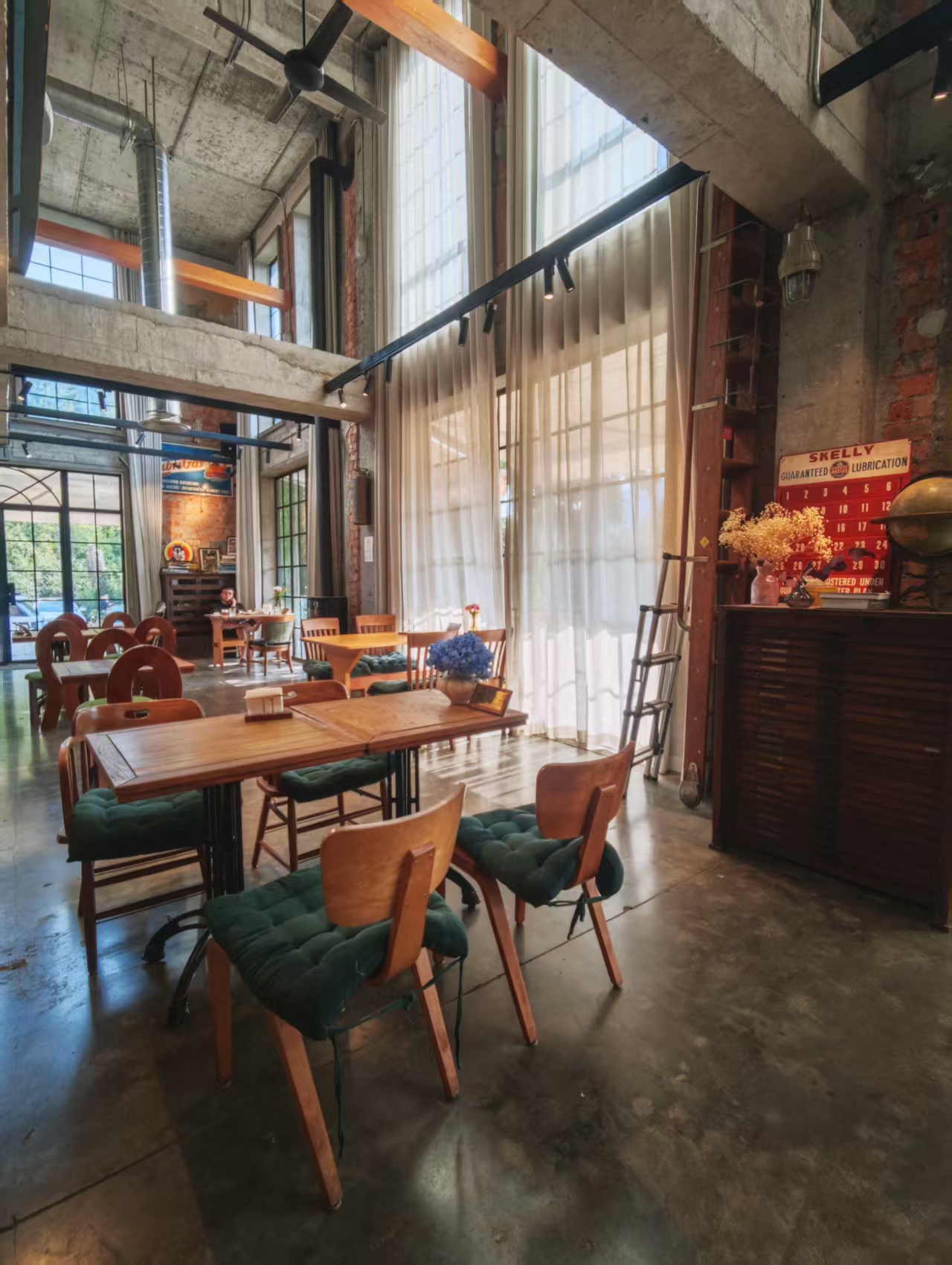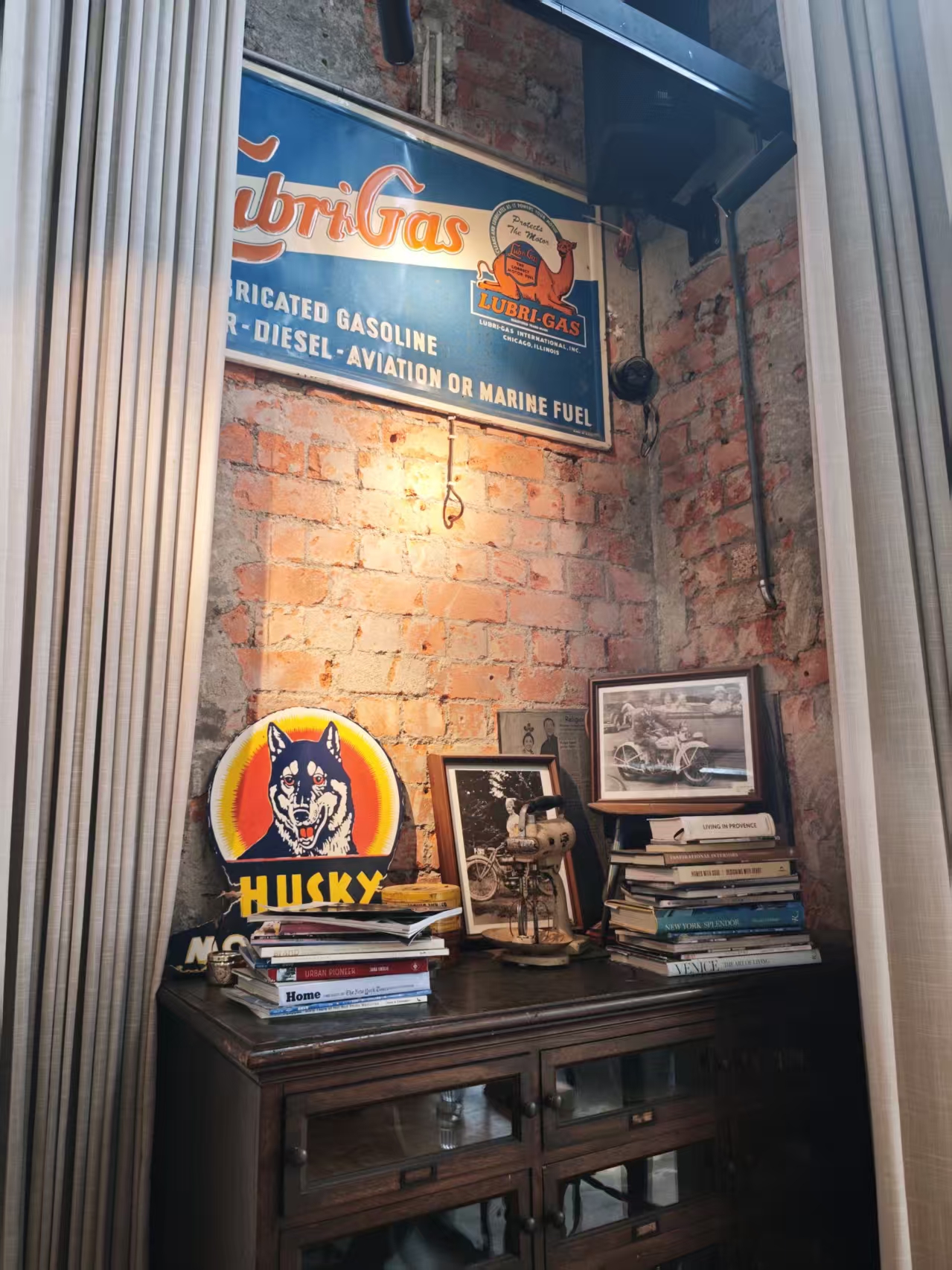 店內(nèi)是超有格調(diào)的工業(yè)風(fēng),皮質(zhì)沙發(fā)配著古董臺燈,瞬間把1960年代的復(fù)古感拉滿,隨便往那一坐,氛圍感照片直接拿捏。