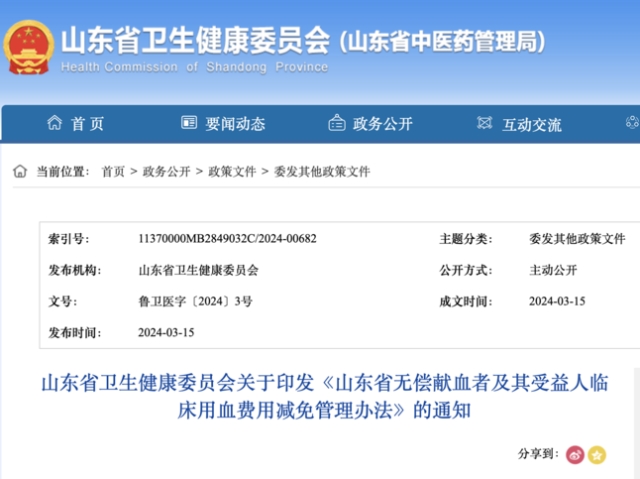山東:無償獻(xiàn)血累計(jì)1000毫升及以上終身享受無限量臨床用血費(fèi)用減免